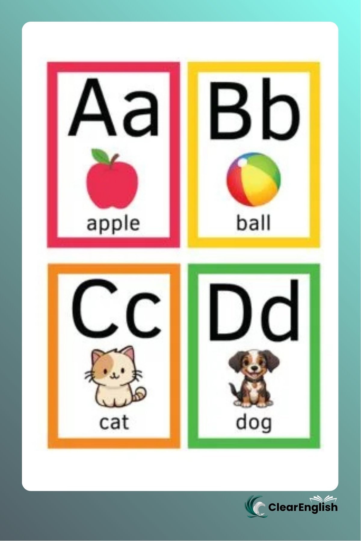26 cards em tamanho A5 com cada letra do alfabeto, uma imagem e a palavra em inglês.