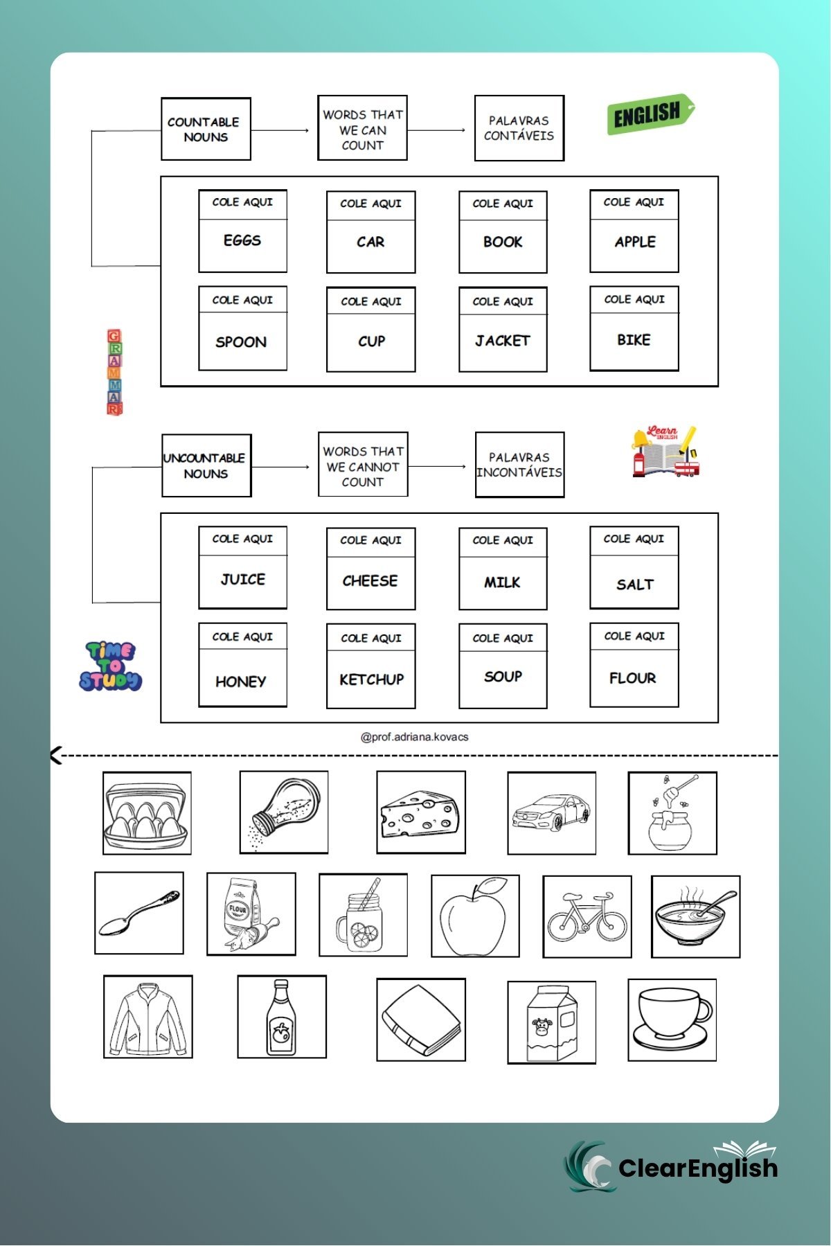 Cansado de procurar recursos pedagógicos de qualidade para suas aulas de inglês? Com o nosso Clube de Assinatura, você terá acesso a uma biblioteca completa de materiais como atividades prontas para imprimir, jogos didáticos e interativos, recursos visuais e sugestões práticas para aplicar em sala de aula.