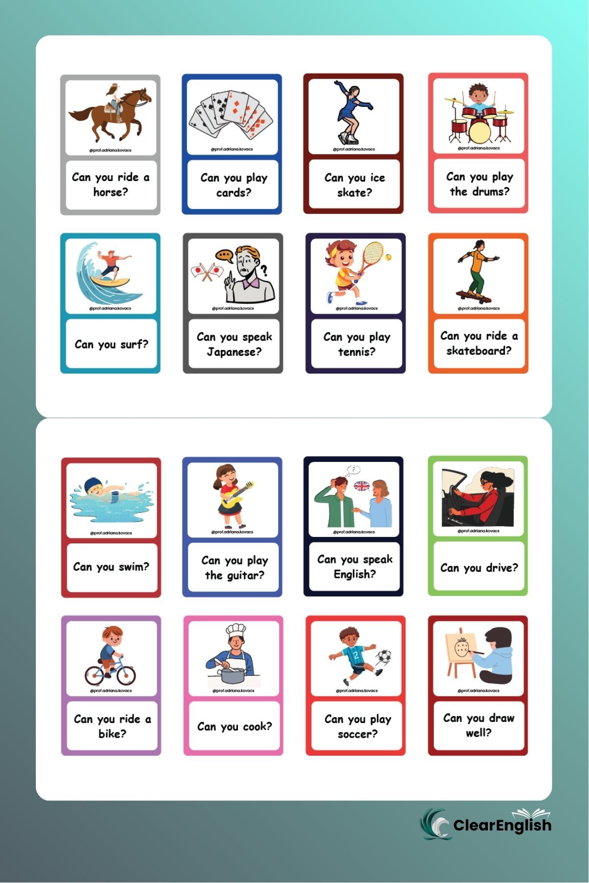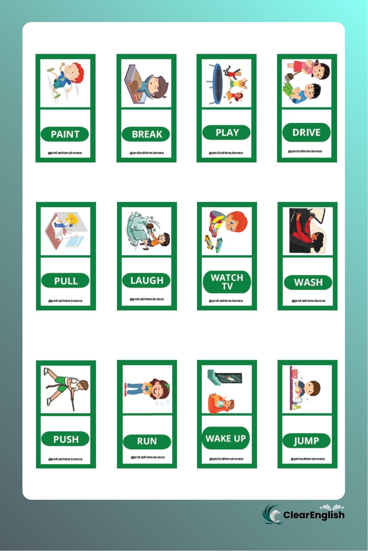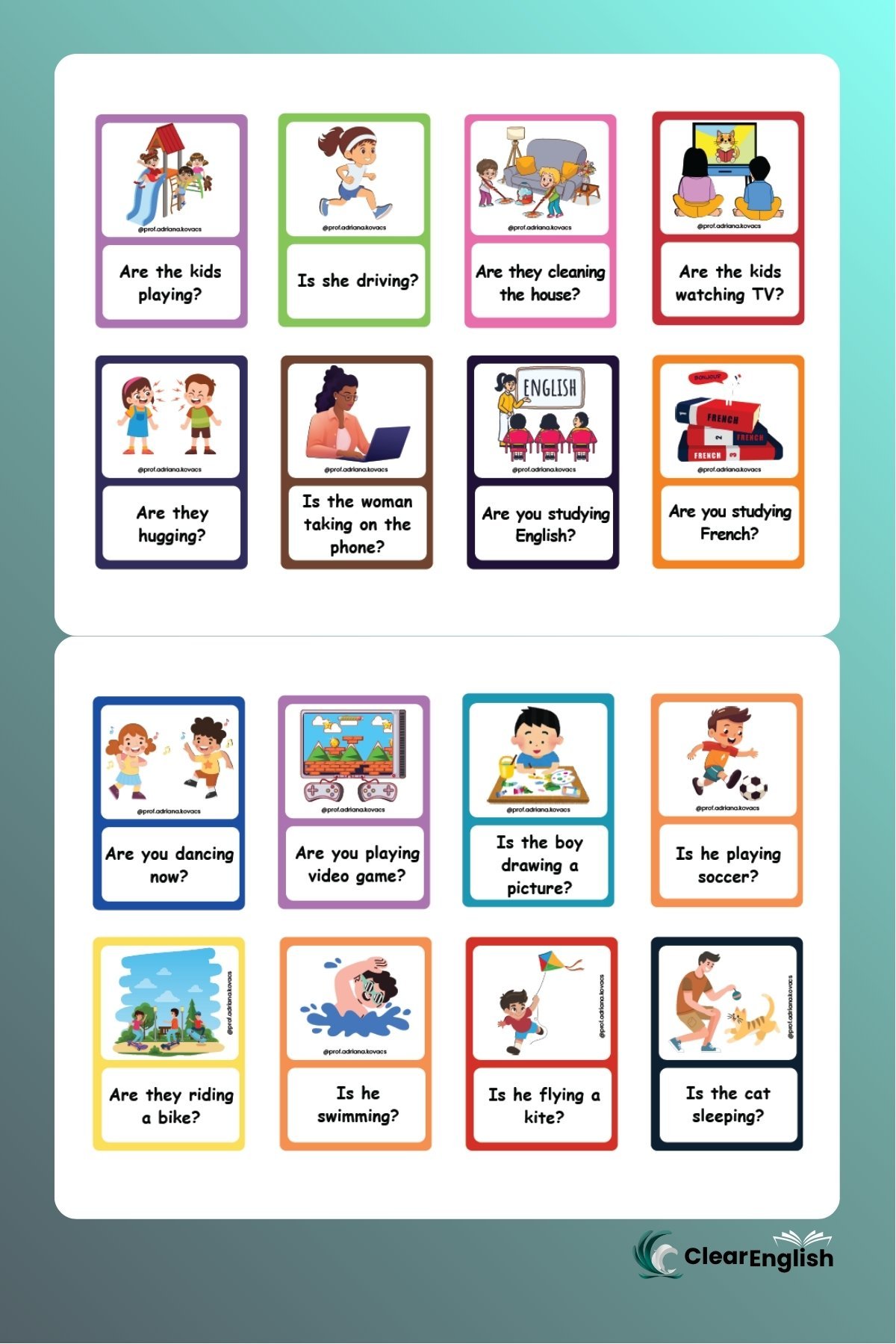 Card game com 40 cartas, perfeito para praticar o “Present Continuous” de forma dinâmica e coletiva.