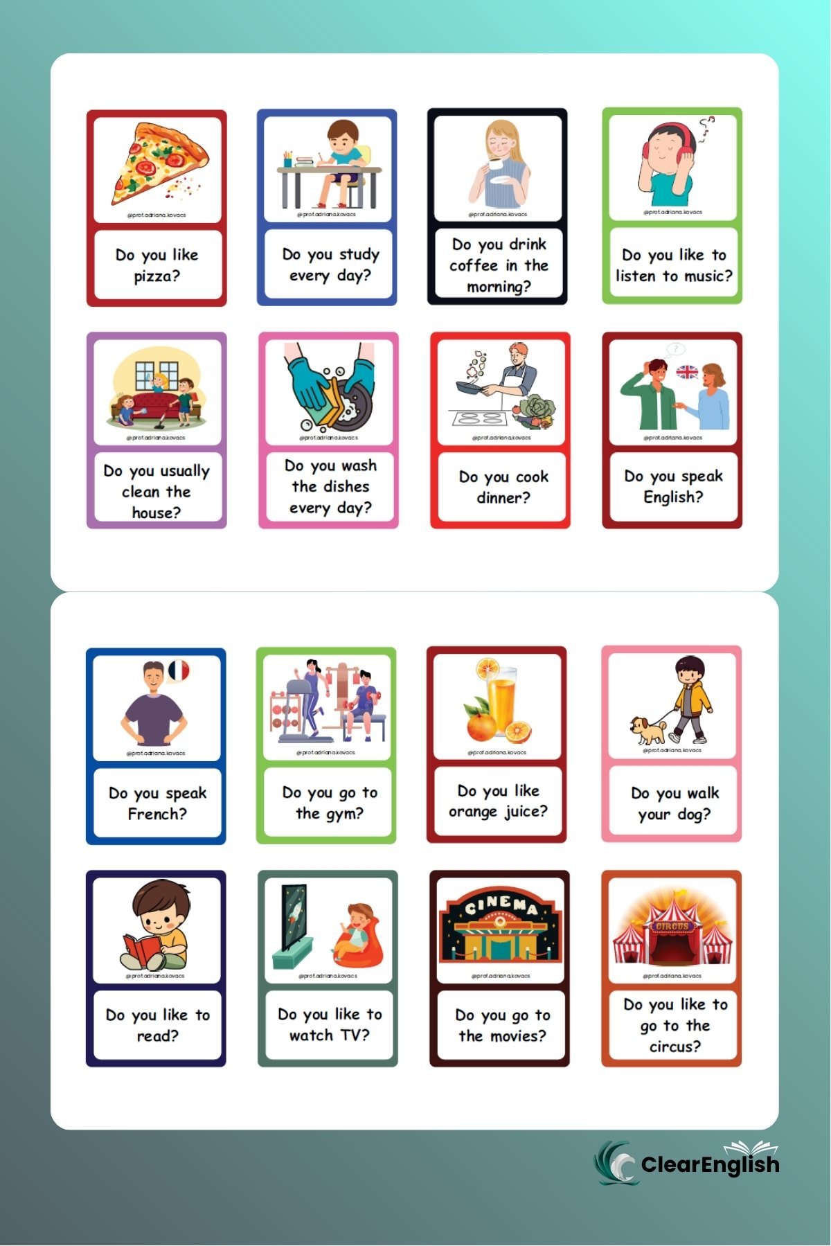 Card game com 40 cartas, perfeito para praticar o “Simple Present” de forma dinâmica e coletiva. Cada card possui imagem e pergunta que exige “short answers”. O jogo promove a participação oral de todos, mesmo nas turmas grandes. Cada aluno tem sua vez de responder rapidamente, garantindo que todos pratiquem e reforcem o conteúdo.