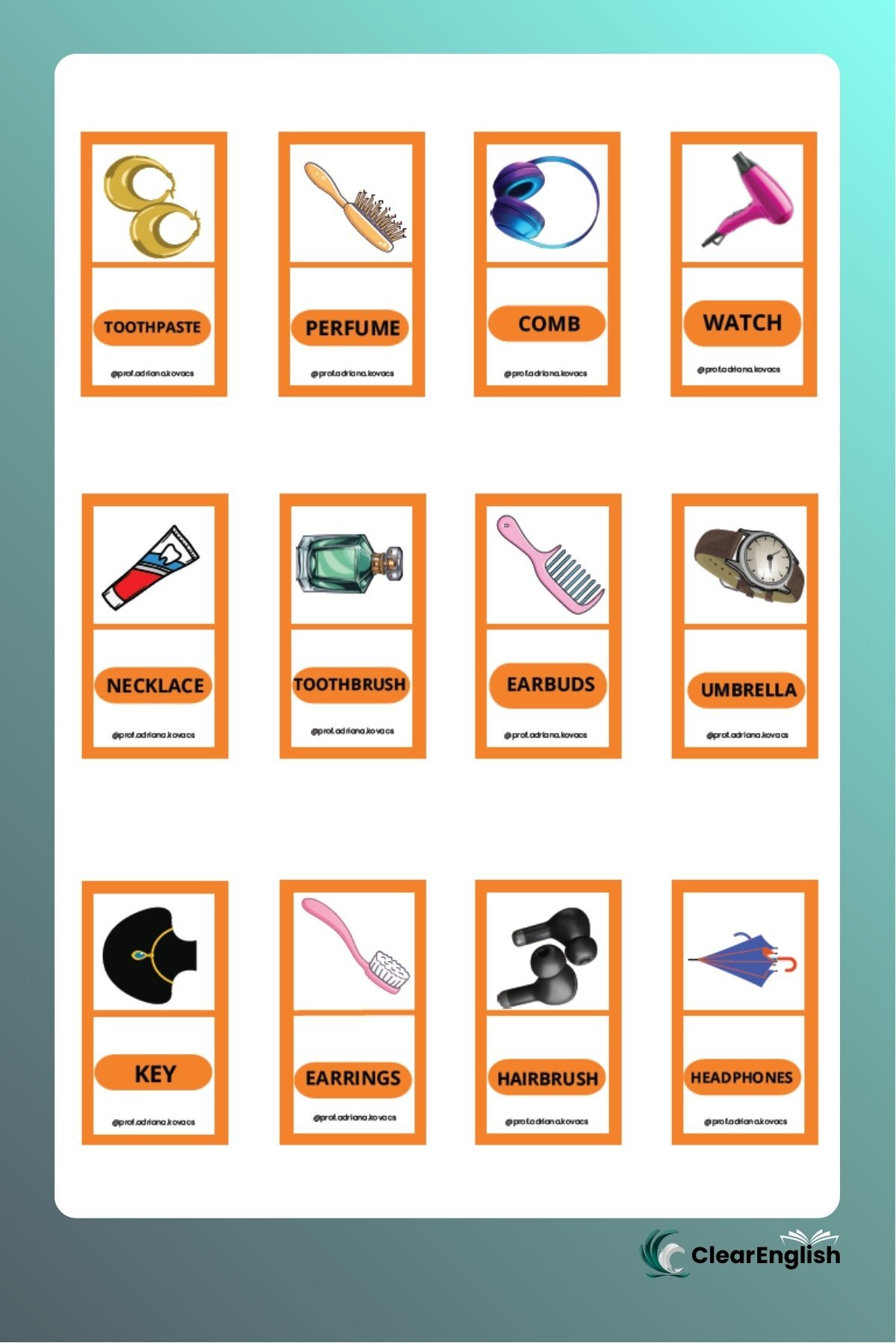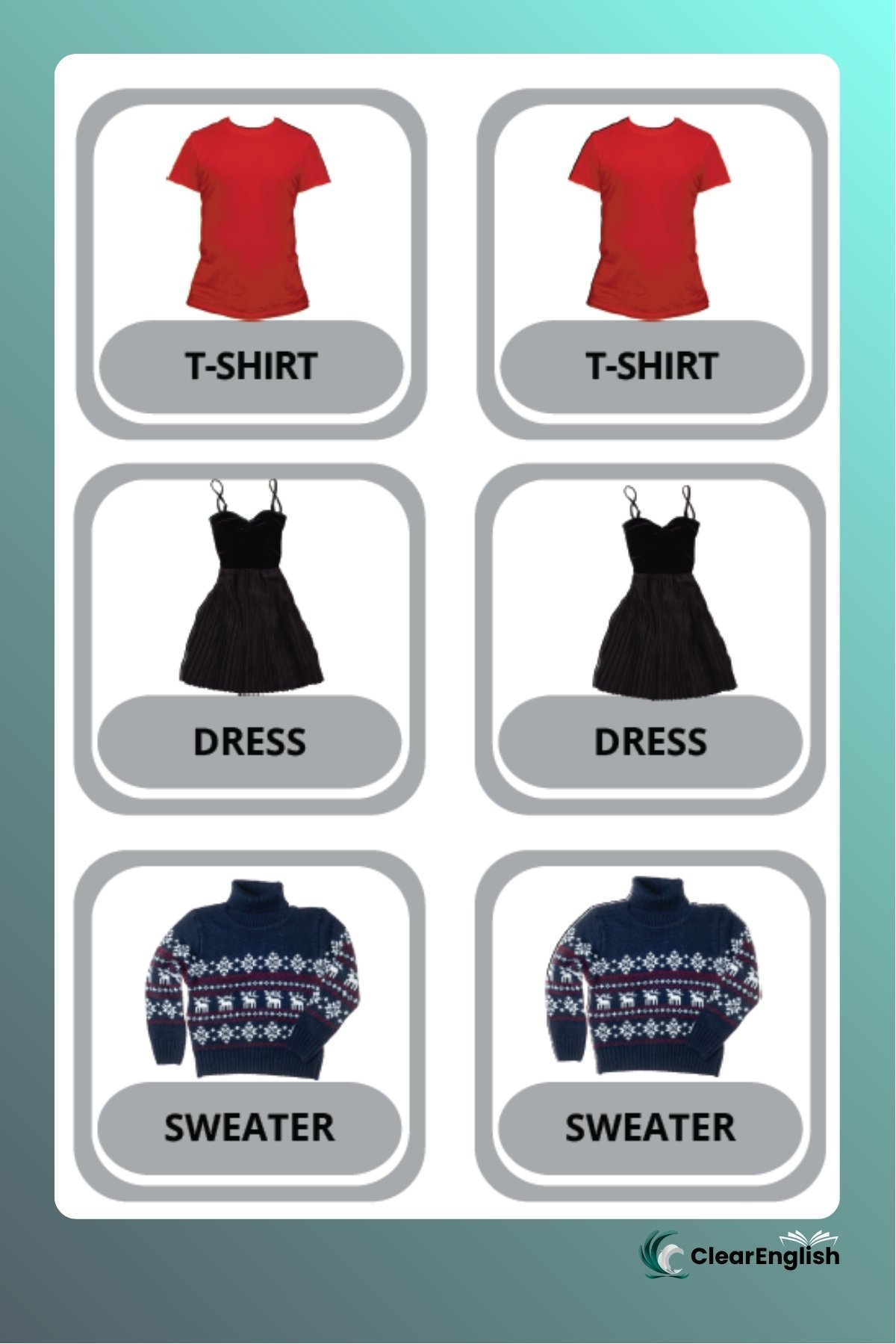 Jogo da memória sobre o tema “Clothes and Accessories” com duas versões. • 1ª versão com o par de cartas iguais contendo imagem e palavra no mesmo card. • 2ª versão com uma carta apenas com a imagem e outra apenas com a palavra. O professor escolhe a versão que melhor se adequar ao nível da sua turma. 36 peças cada versão.