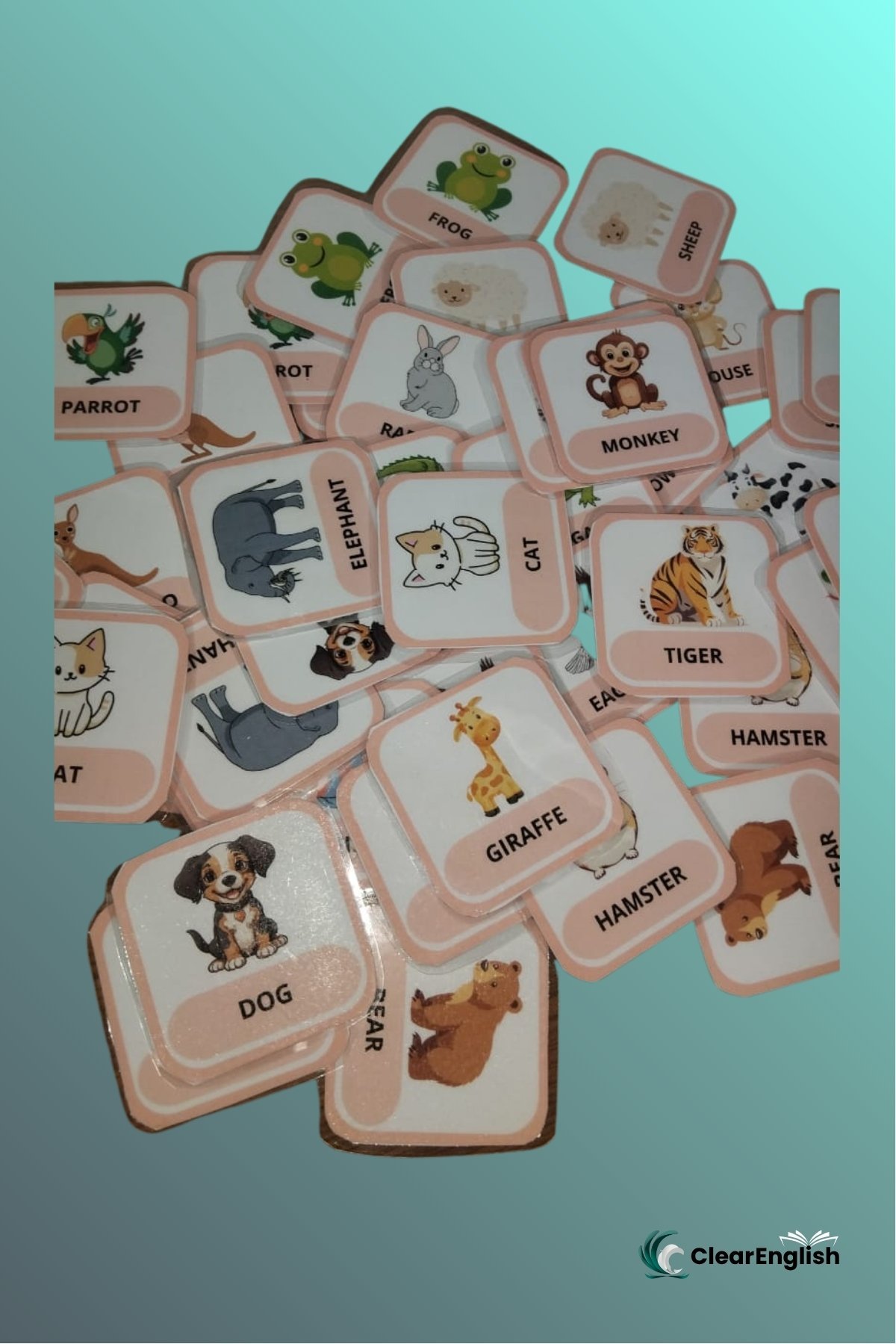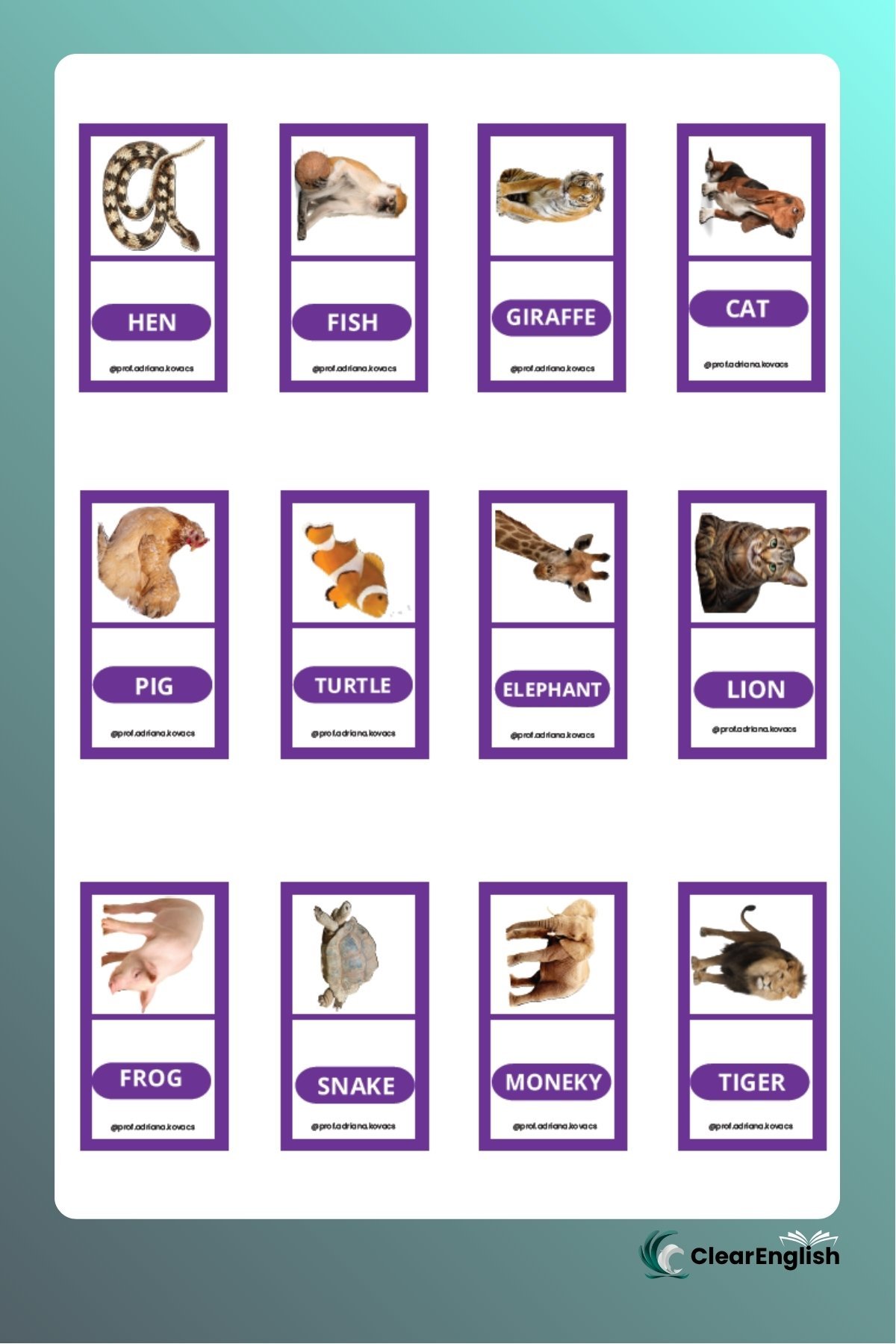 Jogo da memória sobre o tema “Animals” com duas versões. • 1ª versão com o par de cartas iguais contendo imagem e palavra no mesmo card. • 2ª versão com uma carta apenas com a imagem e outra apenas com a palavra. O professor escolhe a versão que melhor se adequar ao nível da sua turma. 48 peças cada versão.