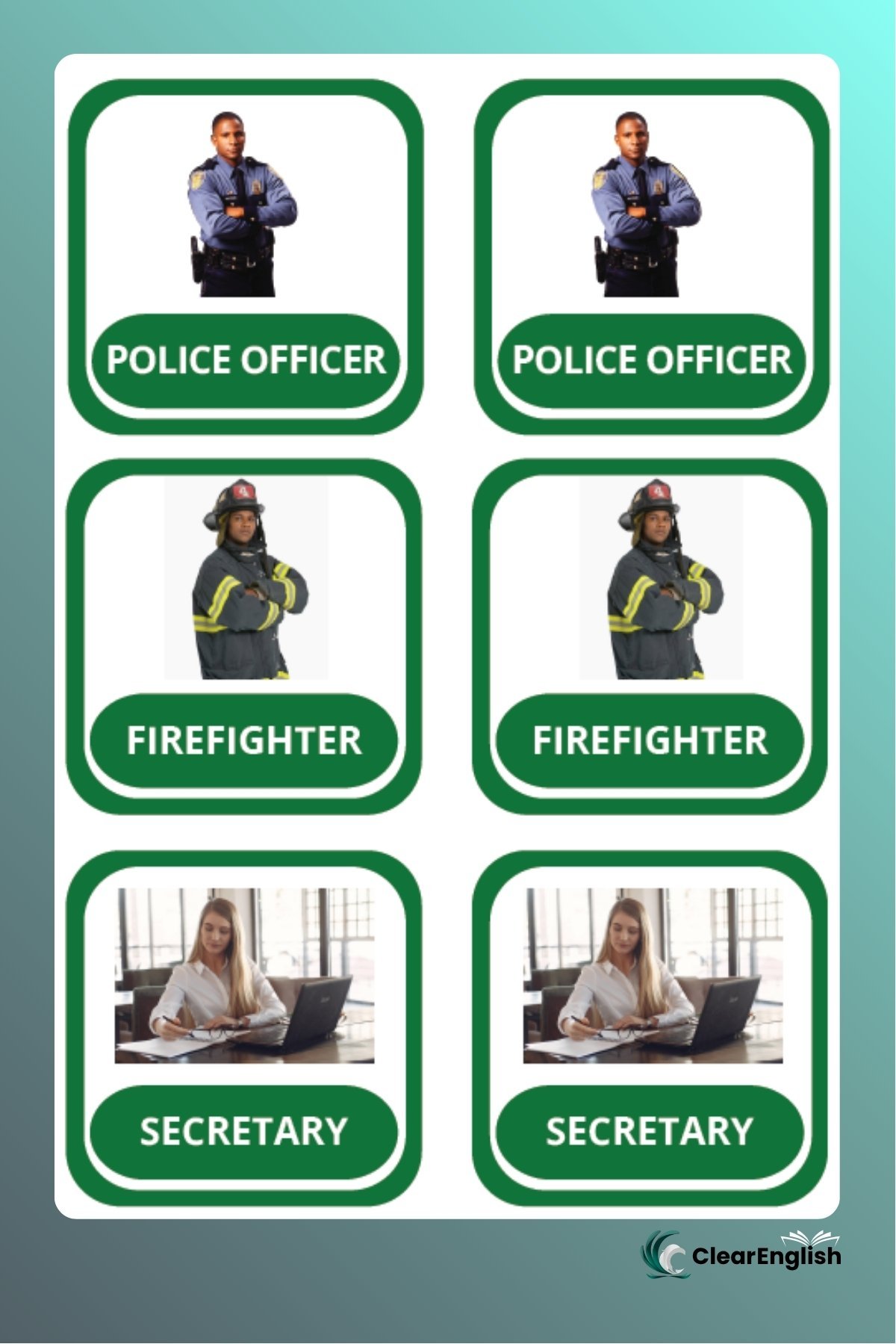 Jogo da memória sobre o tema “Occupations” com duas versões. • 1ª versão com o par de cartas iguais contendo imagem e palavra no mesmo card. • 2ª versão com uma carta apenas com a imagem e outra apenas com a palavra. O professor escolhe a versão que melhor se adequar ao nível da sua turma. 36 peças cada versão.