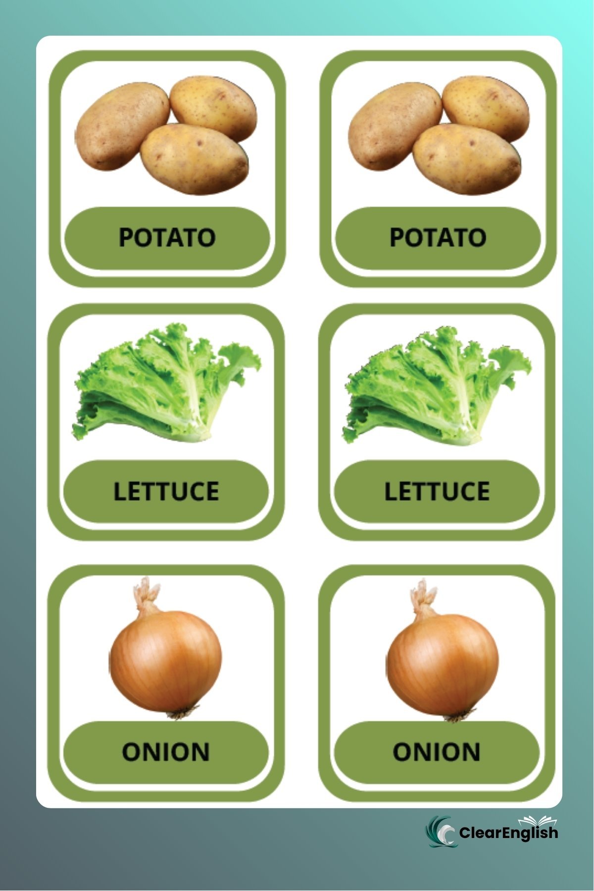 Jogo da memória sobre o tema “Vegetables” com duas versões. • 1ª versão com o par de cartas iguais contendo imagem e palavra no mesmo card. • 2ª versão com uma carta apenas com a imagem e outra apenas com a palavra. O professor escolhe a versão que melhor se adequar ao nível da sua turma. 36 peças cada versão.