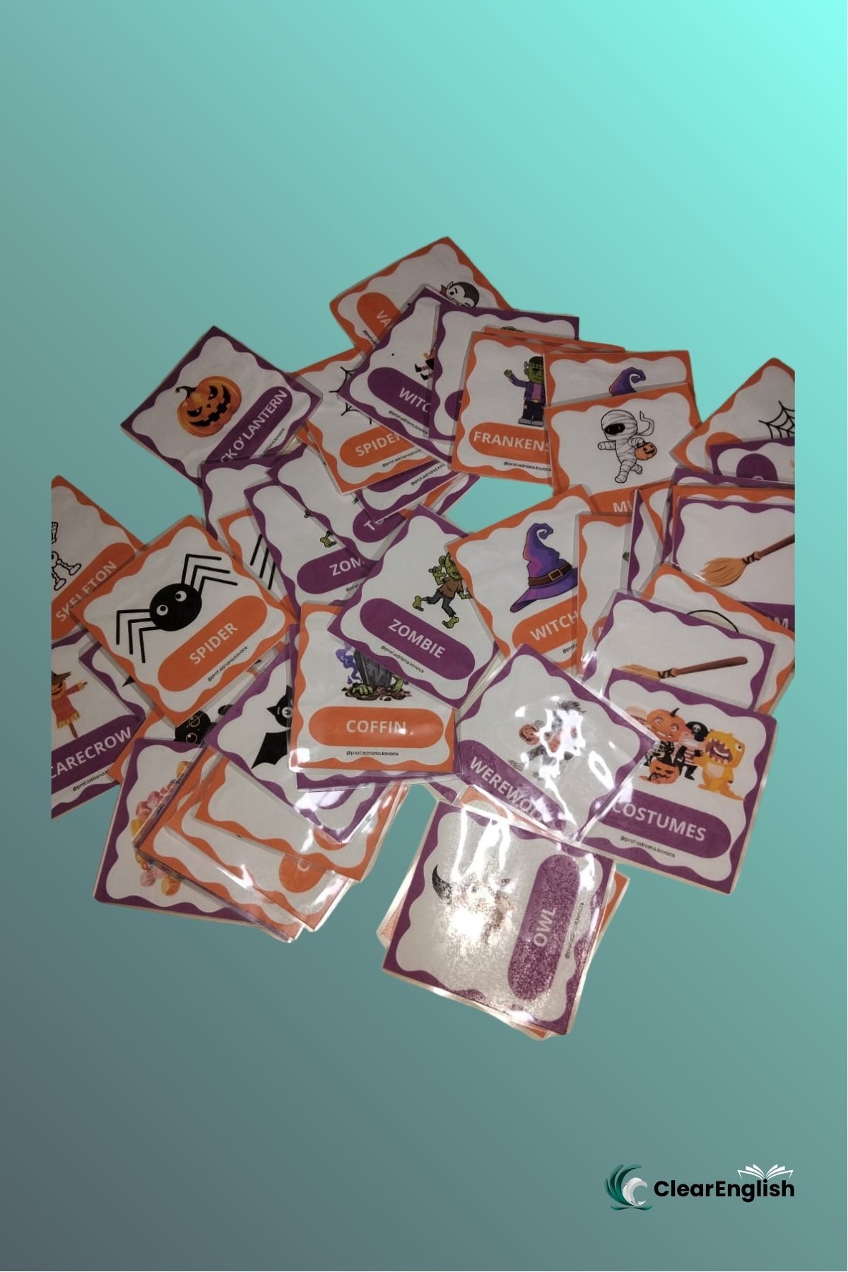 Jogo da memória sobre o tema “Halloween” com duas versões. • 1ª versão com o par de cartas iguais contendo imagem e palavra no mesmo card. • 2ª versão com uma carta apenas com a imagem e outra apenas com a palavra. O professor escolhe a versão que melhor se adequar ao nível da sua turma. 48 peças cada versão.